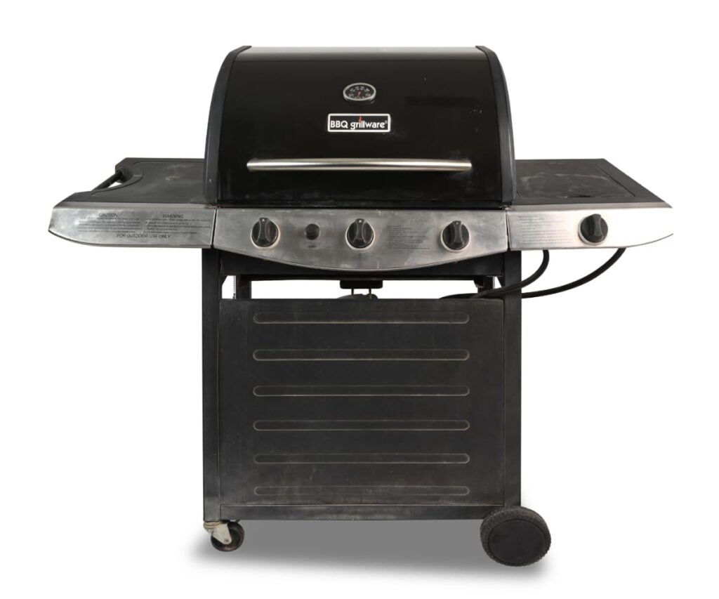 A three‑burner gas grill with side burner, featuring heavy-duty stainless components and generous grilling capacity.
